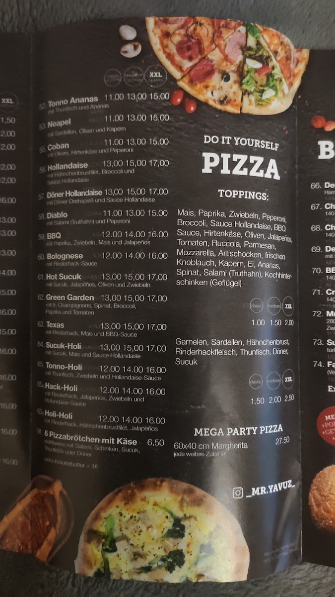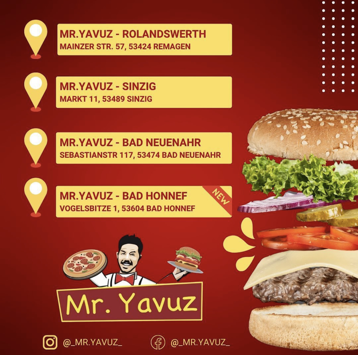 Welcome to Mr. Yavuz Bad Honnef, a delightful pizza restaurant located in the heart of Bad Honnef, Germany. Nestled at Vogelsbitze 1, this eatery has become a favorite for locals and visitors alike. Known for its exceptional quality, Mr. Yavuz offers a diverse menu packed with tantalizing options, from perfectly baked pizzas to mouth-watering burgers and delectable döner kebabs. Customer reviews rave about the freshness and harmonious blend of flavors in every dish. The homemade bread, vibrant veggies, and balanced sauces elevate the experience, making every bite memorable. Despite occasional waits, the passionate staff work tirelessly to deliver great food. Notably, a recent visitor praised the staff’s willingness to accommodate misunderstandings, reflecting their commitment to customer satisfaction. If you're in the area, Mr. Yavuz Bad Honnef is not just a meal, but a culinary experience worth savoring.